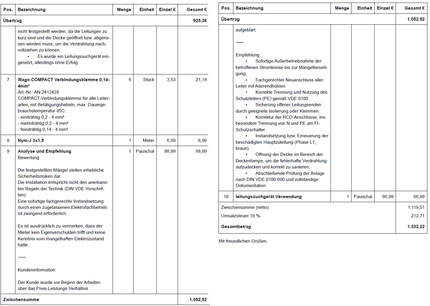 Am Ende präsentierte der Mann eine Rechnung über 1.322,22 Euro. „Die sollten wir sofort bezahlen. Der Mann hat uns noch gesagt, dass das für uns sowieso kein Problem sei, da für die Leitungsprobleme der Vermieter verantwortlich sei.“ Und so wurde die Rechnung noch am selben Abend per Kartenzahlung beglichen.