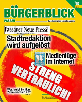 Wer aber dachte, dass lokalnews Passau tatsächlich einen Contrapunkt zum dortigen Monopolisten darstellen würde, sieht sich nun getäuscht. Die neue Online-Zeitung sei „ein gut getarntes Tochterunternehmen“ im „Imperium der Verlegerfamilie Diekmann“, berichtet das Passauer Monatsmagazin Bürgerblick auf seinem Online-Portal und in seiner aktuellen Ausgabe. „Wir werden auch die Belege dafür offen legen“, kündigt Bürgerblick-Herausgeber Hubert Denk an. Er bezeichnet lokalnews Passau als einen „Tarnkappenbomber gegen freie Presse“.