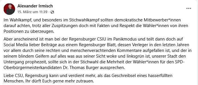 Der SPD-Stadtverbandsvorsitzende Alexander Irmisch kritisierte kürzlich, dass mehrere CSU-Stadträtinnen und Stadträte ein rechtsradikales und rassistisches Fakenews-Posting des Veranstalters Peter Kittel („Regensburger Stadtzeitung“) weiterverbreitet haben.