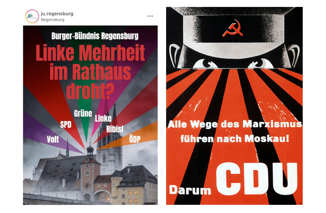 Die Junge Union, die ja nicht ganz so erwachsen sein muss, darf aber weiter zanken. Mit einer Kampagne, die an den Wahlkampf der Unionsparteien vor über 70 Jahren erinnert. Verbunden mit Bildsprache aus dem Jahr 1953 warnen die „kleinen Schwarzen“, deren Liste „Zukunft“ es nicht in den Stadtrat geschafft hat, davor, dass eine „Linke Mehrheit im Rathaus droht“.
