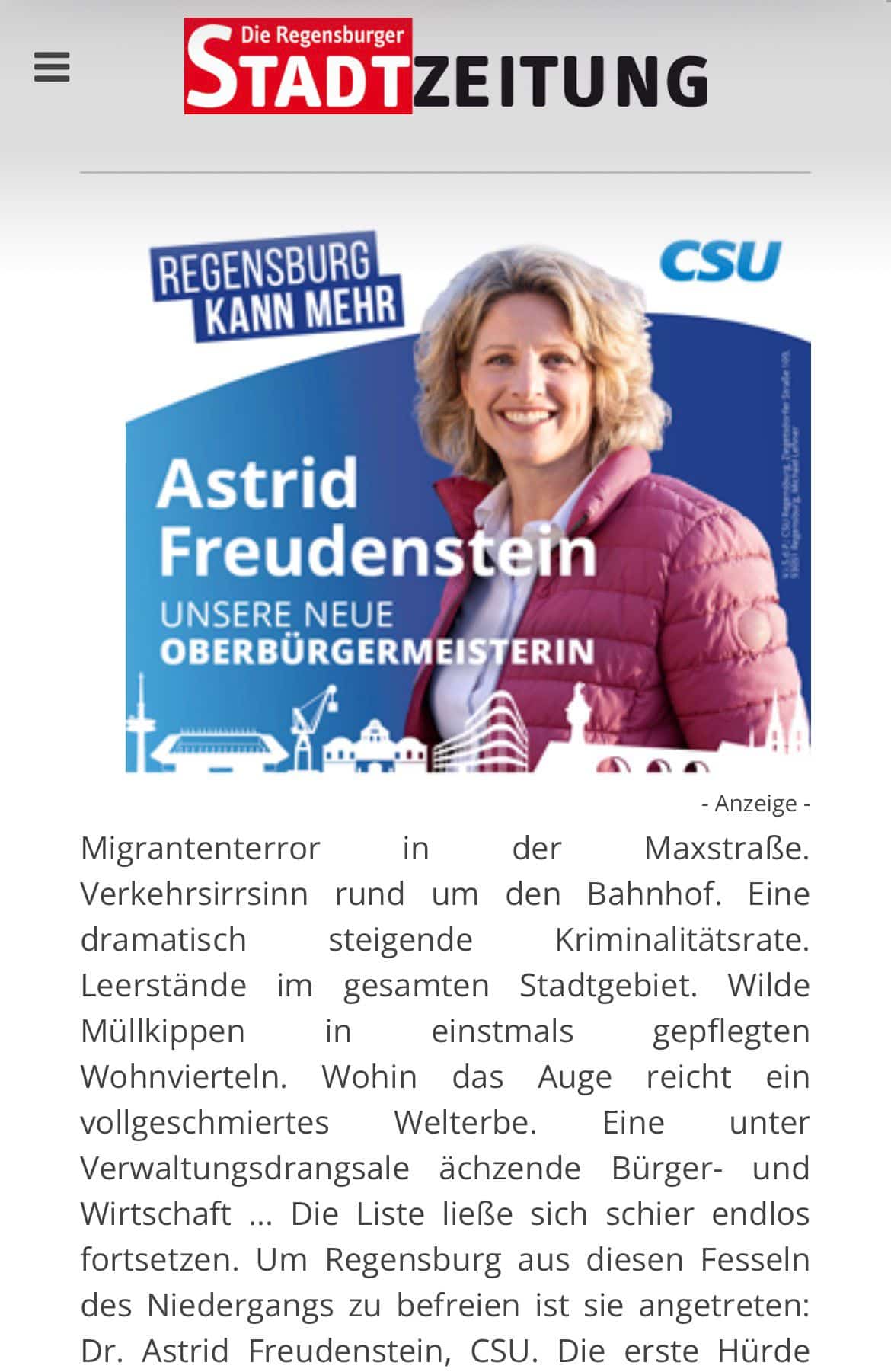 Darin wettert ein nicht namentlich genannter Autor über „Migrantenterror“ und eine „dramatisch steigende Kriminalitätsrate“ und empfiehlt die Wahl von Astrid Freudenstein, um – Vorsicht, Pathos – „Regensburg aus diesen Fesseln des Niedergangs zu befreien“.