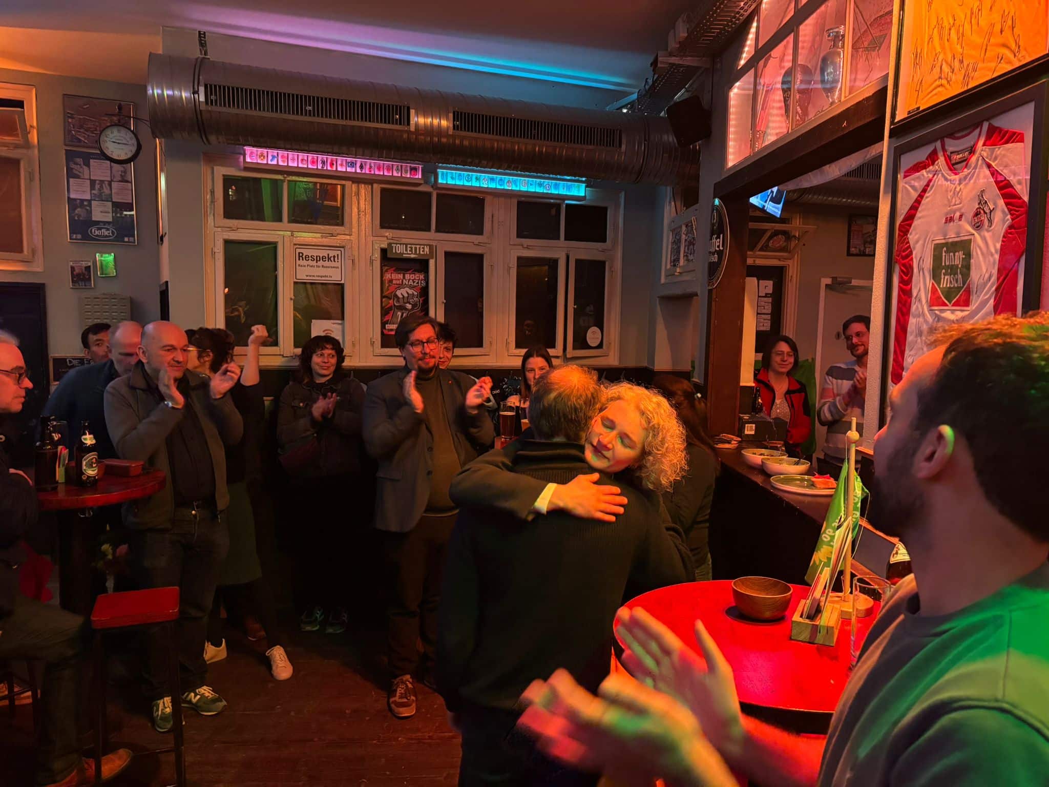 Die Stimmung unter den Gästen ist gut, aber von Freude oder Siegessicherheit zu sprechen, wäre übertrieben. Ein Mann blickt auf die Leinwand und gibt zu bedenken, wenn man die Zahlen „der Linken“ zusammen rechne, komme man auf über 50 Prozent. Er sei verhalten skeptisch. Andere sind da bedeutend siegessicherer.